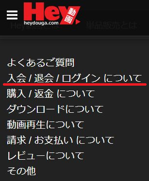 HEY動画のFAQをクリックすると以下のような項目が出てくるので、「入会/退会/ログインについて」をクリックします。